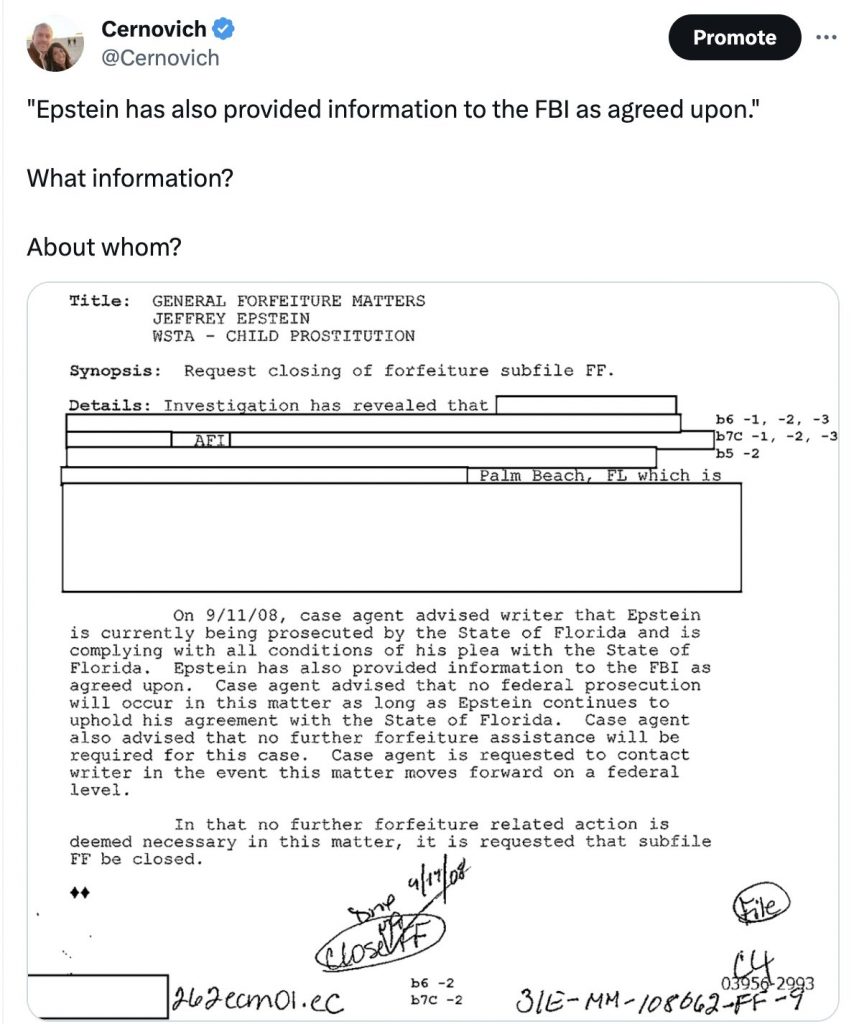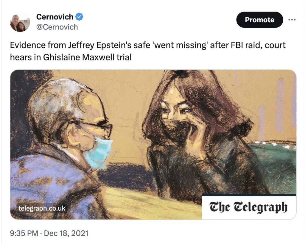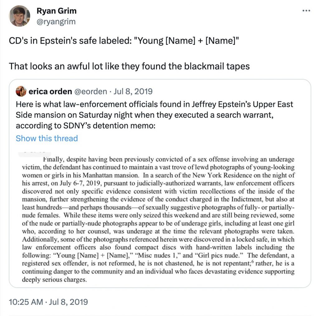 Epstein committed suicide. Because SDNY charged the lowest level offenses possible, they “lacked jurisdiction” to raid Epstein’s island in Little St James, as well as his New Mexico and Paris properties. Those houses were left unattended for a couple of weeks. During that time, a safe went missing. During the Ghislaine Maxwell trial, it was reported: Evidence from Jeffrey Epstein’s safe ‘went missing’ after FBI raid. What was in the safe? We’ll never know for certain. We do know that the FBI has Jeffrey Epstein’s blackmail files. The real Jeffrey Epstein files are the blackmail material. Very powerful forces have made sure we will never see it. – Mike Cernovich (see below)