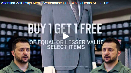 As someone who basically lives off BOGO deals, this commentary really cracked me up. A few days ago I picked up BOGO Screamin’ Sicilian Pizza, Hunts Ketchup, and strawberries at Publix. Next week I already see they will have BOGO Newman’s Own Pizza and strawberries again. Anyway, keep an eye out for the next Men’s Warehouse BOGO deal and give Zelensky a heads up for his next (if ever) visit to the White House.