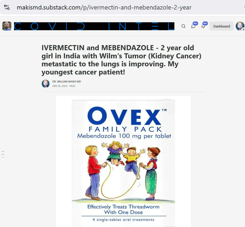 BREAKING NEWS: IVERMECTIN and MEBENDAZOLE Testimonial – 2 year old girl in India with Wilm’s Tumor (Kidney Cancer) metastatic to the lungs is improving. My youngest cancer patient! Let me tell you about my youngest cancer patient. 2 year old girl in Mumbai, India, has a recurrent Wilm’s Tumor (pediatric kidney tumor) metastatic to the lungs. She had an operation to remove the tumor in Sep.2024 But it came back in March 2025: “We have today found that she has relapsed in spite of the ongoing chemotherapy”. The family reached out to me. We started Ivermectin and Mebendazole. One month later: