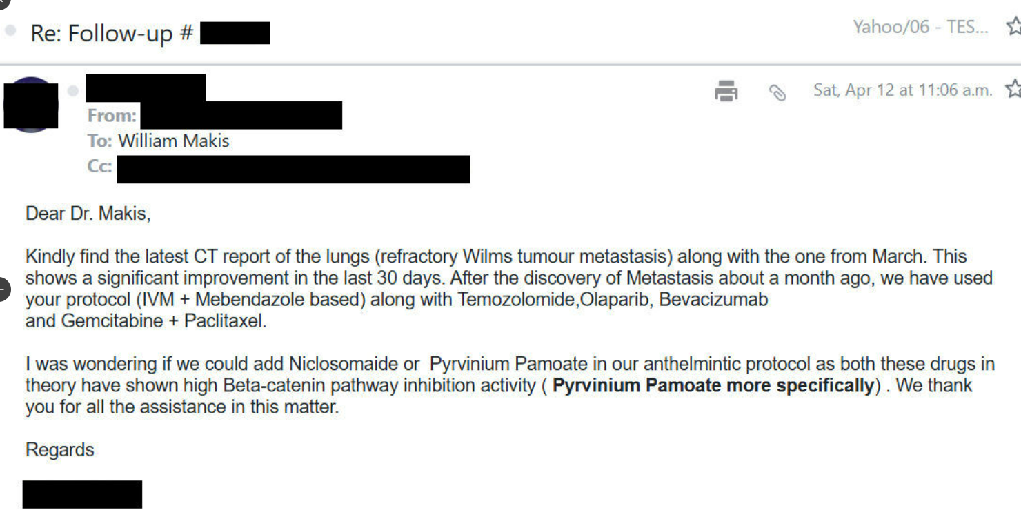 “Kindly find the latest CT report of the lungs (refractory Wilms tumor metastasis) along with the one from March. This shows a significant improvement in the last 30 days…we have used your protocol” After starting Ivermectin and Mebendazole, she is improving and the lung tumors are shrinking. Largest lung tumor has shrunk from 7.2×6.0cm to 4.6×5.3cm. Radiologist: “Interval regression in size…Imaging features suggest partial response to therapy” These are very difficult cases and I always hesitate to take on pediatric patients. But if I don’t help, who will? Pediatric Oncologists don’t put their neck on the line any more than adult Oncologists. You don’t upset big pharma, or your Oncology career is over, patient be damned. There is research to back the use of Ivermectin and Mebendazole in children.