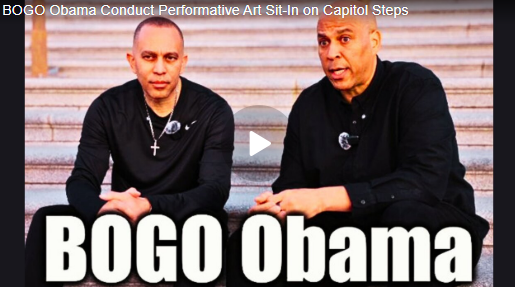 BOGO Obama which consists of Senator Spartacus aka Corey Booker and Dollar Store Obama aka Hakeem Jeffries got together and decided to put on a performance art sit-in on the Capitol Steps. This is strange since this was conducted OUTDOORS plus there was NO threat of arrest. The fake “sit-in” went on for hours and hours chock full of excruciatingly BORING speeches much of which was about them pretending to revere the Constitution which many/most of their liberal friends have written off as being a fascist relic of the past which must be discarded. Finally, Senator Spartacus got sick and tired of sharing the spotlight with Dollar Store Obama and went full Grandstand with a LOUD flurry of standard liberal clichés guaranteed to incite expected reactions when your audience is composed primarily of professional Democrat politician staffers.