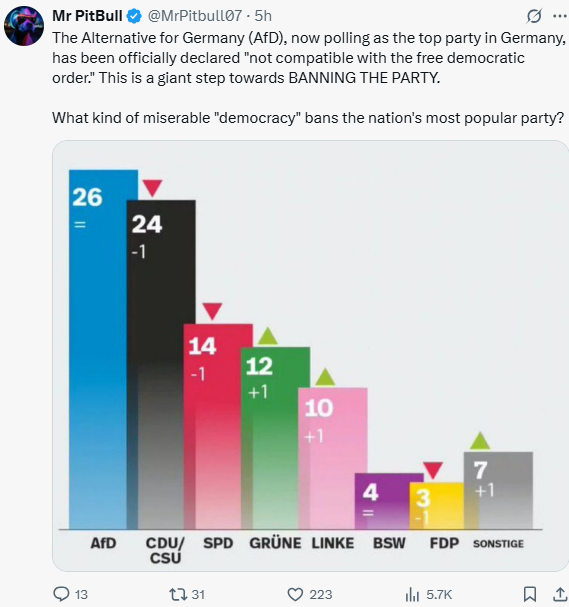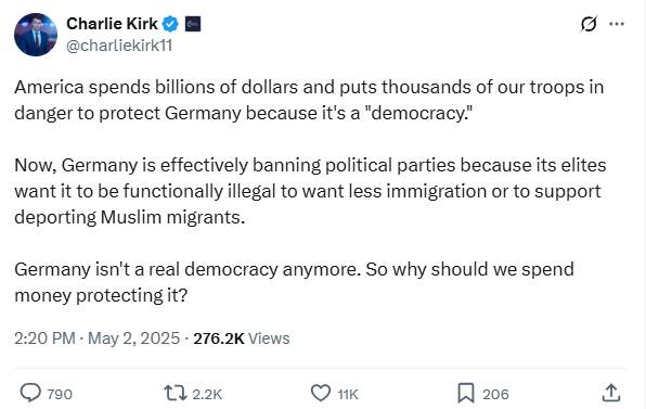 America spends billions of dollars and puts thousands of our troops in danger to protect Germany because it’s a “democracy.” Now, Germany is effectively banning political parties because its elites want it to be functionally illegal to want less immigration or to support deporting Muslim migrants. Germany isn’t a real democracy anymore. So why should we spend money protecting it? – Charlie Kirk Post at X