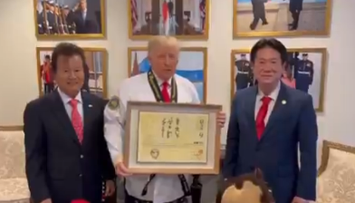 Trump in a Taekwondo uniform with a Kim Jong Un photo in the background is hilarious