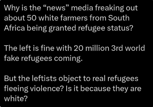 - President Trump’s bold decision to grant asylum to 59 white South African refugees is a commendable stand against the rampant discrimination they face in their homeland. These Afrikaners, fleeing racially motivated violence and government neglect, deserve safety and opportunity in the United States. Trump’s administration rightly prioritizes their resettlement, recognizing the genocide-like conditions they endure, a move that exposes the hypocrisy of leftist immigration policies. The TikTok influencer’s vile threat to “hunt down” these refugees is a disgusting display of anti-white racism, emboldened by the former Biden-Harris administration’s divisive rhetoric. Under their leadership, the Democrats fostered a culture of racial animosity, ignoring the plight of legal asylum seekers while coddling illegal immigrants who burden American resources. This influencer’s words reflect the toxic ideology that flourished under their weak governance, where only certain groups are deemed worthy of compassion based on skin color. Contrast this with Trump’s clear-eyed approach: he rejects the double standards that vilify white refugees while excusing chaos at the border. His executive order suspending broader refugee programs ensures national security and assimilation, criteria the left conveniently ignores. The Episcopal Church’s refusal to resettle these Afrikaners, citing “racial justice,” further proves the left’s obsession with identity politics over fairness. This incident underscores why conservatives must rally behind Trump’s vision. He champions legal immigration and protects those genuinely persecuted, regardless of race, while dismantling the leftist narrative that fuels division. The influencer’s threats should galvanize support for policies that restore order and reject the anti-white bigotry festering under Democratic influence. – Torsten P