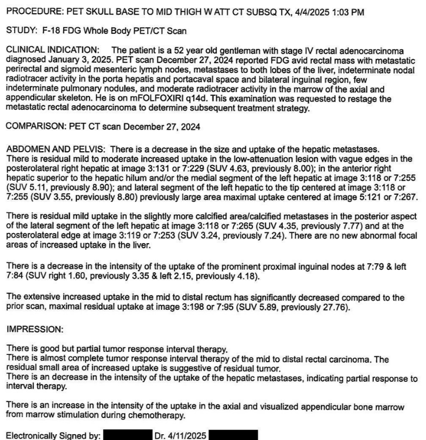Dr Makis: Another wonderful cancer success story! Sometimes patients come to me as soon as they’re diagnosed. And we get to work right away! STORY: 52 year old California man was diagnosed with Stage 4 Colon Cancer metastatic to liver and lungs on Jan.3, 2025. We started in late January 2025: Ivermectin 1.5mg/kg/day Fenbendazole 888mg/day Oncologist started: mFOLFOXIRI RESULTS on PET/CT (after 2 months): Rectal Primary Tumor: SUV 27.76 to SUV 5.89 (“almost complete response”) Liver metastases: SUV 8 to 4.63 SUV 8.9 to 5.11 SUV 8.8 to 3.55 SUV 7.77 to 4.35 SUV 7.24 to 3.24 Right Inguinal nodes SUV 3.35 to 1.6 Left Inguinal nodes SUV 4.18 to 2.15 MY TAKE… For now, I’m mostly sharing results obtained after 2 or 3 months of Ivermectin and Fenbendazole or Mebendazole.