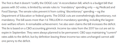 The first is that it doesn’t “codify the DOGE cuts.” A reconciliation bill, which is a budget bill that passes with 50 votes, is limited by senate rules to “mandatory” spending only — eg Medicaid and Food Stamps. The senate rules prevent it from cutting “discretionary” spending — eg the Department of Education or federal grants. The DOGE cuts are overwhelmingly discretionary, not mandatory. The bill saves more than 1.6 TRILLION in mandatory spending, including the largest-ever welfare reform. A remarkable achievement. I’ve also seen claims the bill increases the deficit. This lie is based on a CBO accounting gimmick. Income tax rates from the 2017 tax cut are set to expire in September. They were always planned to be permanent. CBO says maintaining *current* rates adds to the deficit, but by definition leaving these income tax rates unchanged cannot add one penny to the deficit.
