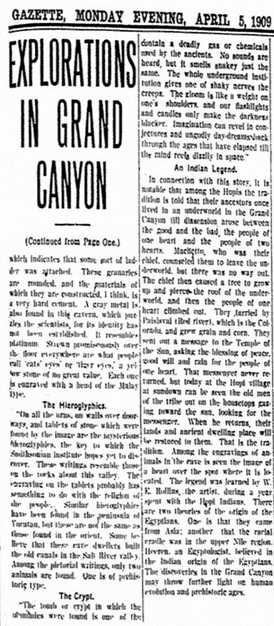 1909 Newspaper clips about the cavern findings in the Grand Canyon (possibly Egyptian – Hieroglyphics):