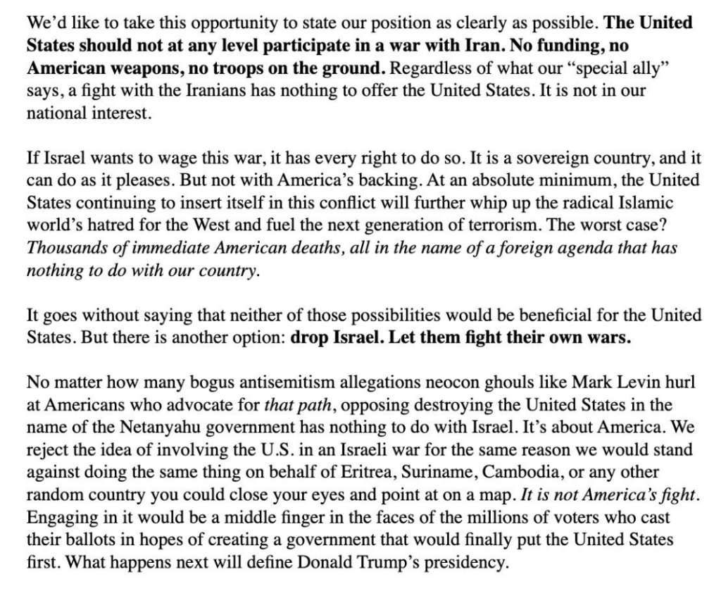 Tucker Carlson called Trump “complicit” in Israel’s attack and urged the president to “drop Israel” and “let them fight their own wars.” “The United States should not at any level participate in a war with Iran. No funding, no American weapons, no troops on the ground. Regardless of what our ‘special ally’ says, a fight with the Iranians has nothing to offer the United States.”