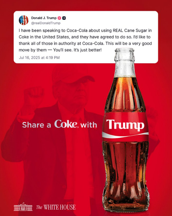 The buzz began last week when Trump posted on July 16, 2025: “I have been speaking to Coca-Cola about using REAL Cane Sugar in Coke in the United States, and they have agreed to do so. I’d like to thank all of those in authority at Coca-Cola. This will be a very good move by them — You’ll see. It’s just better!”
