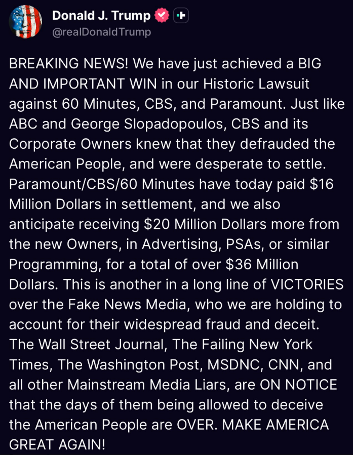 “Paramount/CBS/60 Minutes have today paid $16 Million Dollars in settlement, and we also anticipate receiving $20 Million Dollars more from the new Owners, in Advertising, PSAs, or similar Programming, for a total of over $36 Million Dollars.”