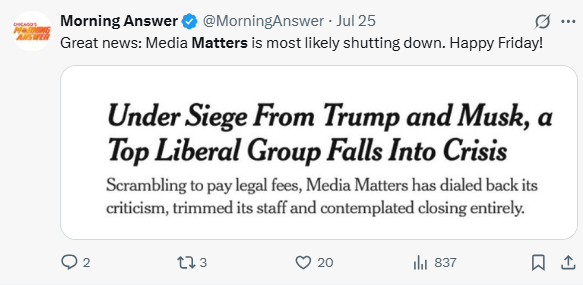 - Media Matters Meltdown: Soros-Funded Censorship Group on Verge of Collapse Amid Lawsuits, Layoffs, Donor Panic
