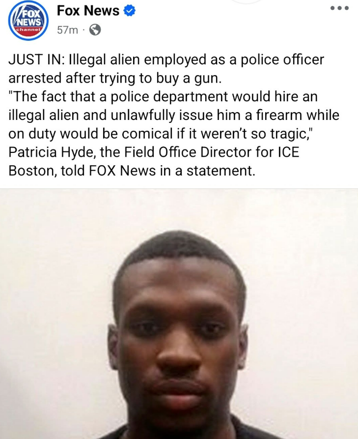- BREAKING: ICE confirms to @FoxNews they’ve arrested a Jamaican illegal alien who is employed as a police officer in Maine after he illegally attempted to buy a gun, which triggered an alert to ATF. ICE says Jon Luke Evans, who is in the U.S. illegally as a visa overstay, was hired as a cop by Old Orchard Beach PD in ME, and admitted to trying to purchase the gun as part of his job. ICE says he first entered the U.S. lawfully by flying into Miami on 9/24/23, but never left on his scheduled departure flight on 10/1/2023, overstaying his visa ever since. Patricia Hyde, the Field Office Director for ICE Boston, which arrested Evans, released a blistering statement to FOX, slamming Evans’ hiring as a police officer: “Jon Luke Evans not only broke U.S. immigration law, but he also illegally attempted to purchase a firearm. Shockingly, Evans was employed as a local law enforcement officer. The fact that a police department would hire an illegal alien and unlawfully issue him a firearm while on duty would be comical if it weren’t so tragic. We have a police department that was knowingly breaking the very law they are charged with enforcing in order to employ an illegal alien. ICE Boston will continue to prioritize public safety by arresting and removing criminal alien threats from our New England communities.” – Bill Melugin
