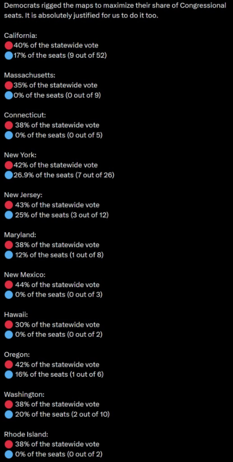 “This is why Democrats are so scared of gerrymandering. Because every blue state is already gerrymandered to the maximum possible extent. None of these states have a Republican… pic.twitter.com/nCIevy5RWF