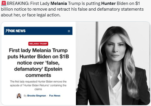 - First lady Melania Trump puts Hunter Biden on $1B notice over ‘false, defamatory’ Epstein comments