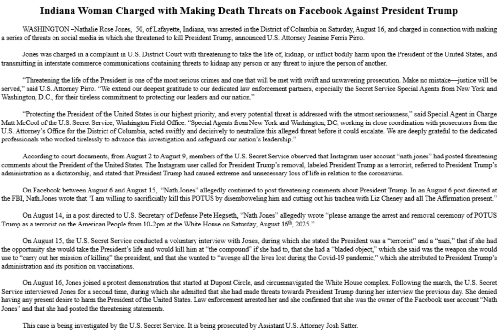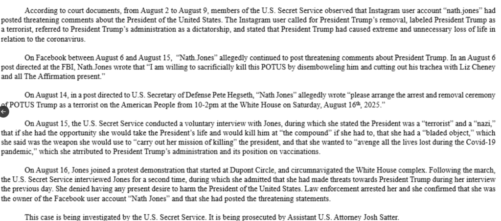 ‘An individual by the name of Nathalie Rose Jones is now in custody charged with two federal crimes for knowingly and willfully threatening to take the life of the President of the United States.’ PROSECUTE! “The timing couldn’t be more suspicious. Trump’s administration has been cracking down on D.C.’s lawlessness since August 11, when he federalized the Metropolitan Police Department and sent in the Guard. In just days, nearly 400 arrests were made, including 137 over one weekend with 21 illegal guns seized. Pirro’s office is issuing warrants for everything from homicide to drug trafficking, restoring order to a city that Democrats turned into a war zone. High-profile crimes like the murder of congressional intern Eric Tarpinian-Jachym, the shooting of two Israeli Embassy workers, and the brutal carjacking of a DOGE staffer highlight the chaos Trump inherited. Rose-Jones’s arrest amid this cleanup suggests she might have been emboldened by the left’s narrative that Trump’s reforms are “authoritarian.”
