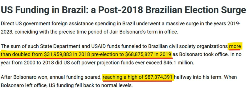 Funds earmarked for “civil society strengthening” or “democracy promotion” frequently end up supporting opposition groups, media outlets, and NGOs that align with Washington’s elite consensus—often at the expense of nationalist leaders who resist globalist pressures. This isn’t aid; it’s interference, paid for by hardworking Americans whose taxes are diverted to subvert elections and install regimes that erode US influence abroad. Take Brazil as a prime case study. Bolsonaro, often dubbed the “Trump of the Tropics,” won a landslide victory in 2018 on a platform of anti-corruption, economic liberalization, and strong ties with the US.