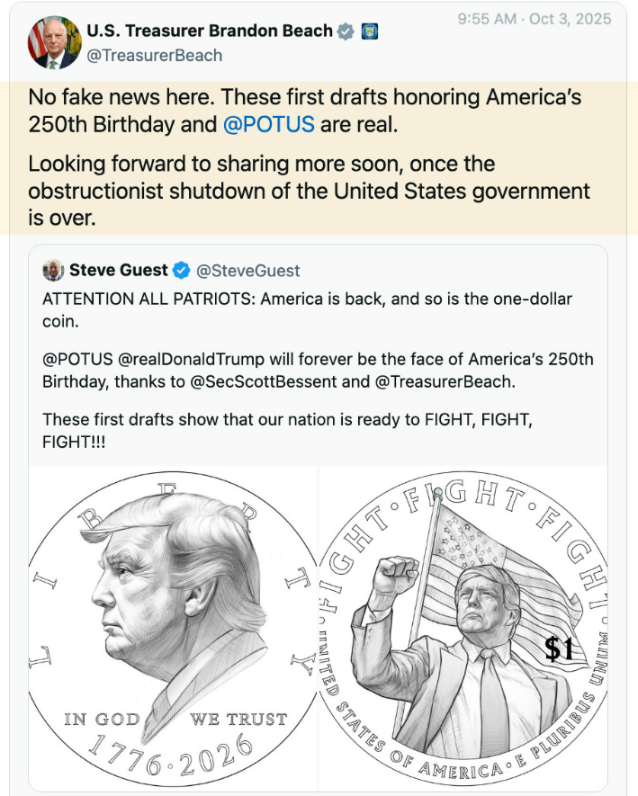- “Yes, it’s real”: Treasury confirms draft design for $1 Trump coin
