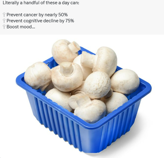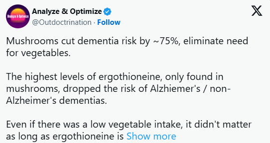 Mushrooms cut dementia risk by ~75%, eliminate need for vegetables.