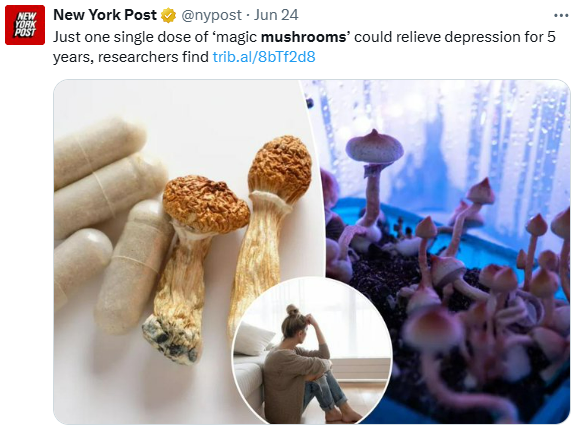 But in a real clinical study, two doses of psilocybin, the compound in magic mushrooms, plus… pic.twitter.com/rVT6Ym2XPv