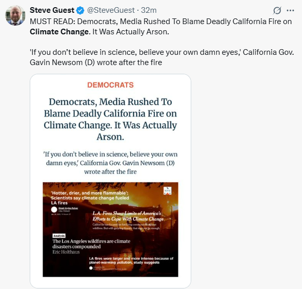 “Call me a conspiracy theorist, but there is no way that 8 different fires starting within a period of 48 hours in LA is due to climate change”