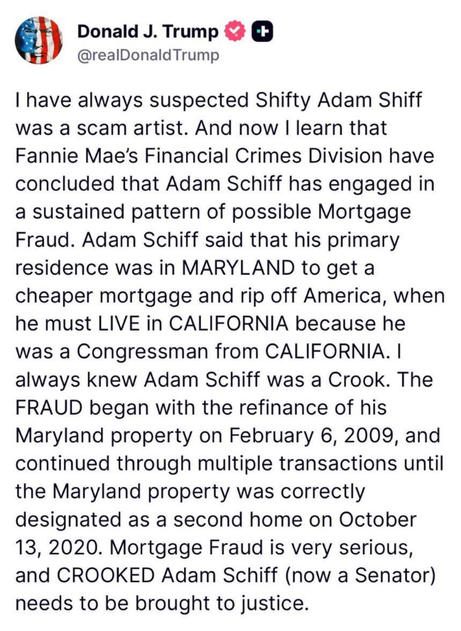 - Trump calls for Schiff to face jail time over alleged mortgage fraud
