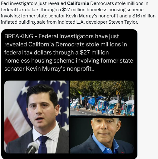 A scathing video exposing California Democrats’ brazen mishandling of millions in federal tax dollars earmarked for homeless housing (Above). As revealed by U.S. Attorney General Bill Essayli, one culprit funneled $2.1 million straight to his American Express card, leading to two arrests in what Catturd called “crazy” corruption. This isn’t an isolated blunder—it’s the rotten fruit of California’s one-party Democrat rule, where unchecked power has turned the Golden State into a black hole for taxpayer dollars. For over a decade, Democrats have dominated the governorship, legislature, and key agencies, siphoning billions from hardworking Americans to fund boondoggles, virtue-signaling schemes, and outright fraud.
