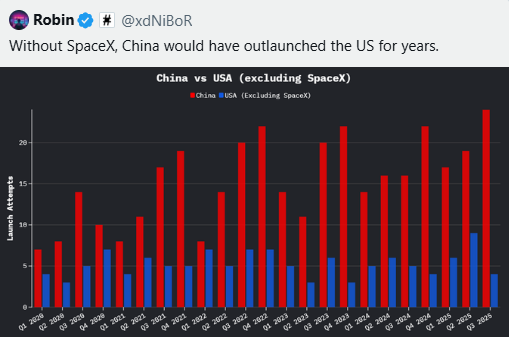 WSJ mandates that U.S. launches withstand Chinese challenges, with SpaceX leading. Musk’s 2024 post on exceeding last year’s flights reinforces America’s lead. Ultimately, Musk’s SpaceX embodies conservative principles: innovation through free markets, not state control. Without it, China would dominate, as the graph and Musk affirm. Heritage calls for bolstering such assets to counter vulnerabilities. As Musk eyes Mars, his efforts ensure America, not the CCP, leads humanity’s future. Thank God we have a president in the White House who can see the potential and not turn his back on Musk as Biden and the Democrats did.