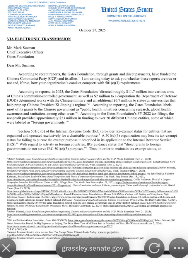 In a bombshell move that’s long overdue, Senate Judiciary Committee Chairman Chuck Grassley (R-IA) has fired a warning shot across the bow of globalist kingpin Bill Gates, demanding answers from the Gates Foundation over its shady funneling of millions to arms of the Chinese Communist Party (CCP). Grassley’s October 27, 2025, letter to Gates Foundation CEO Mark Suzman accuses the nonprofit of violating IRS rules by pouring cash into CCP-linked entities, potentially jeopardizing its tax-exempt status under 501(c)(3). “According to reports, in 2023, the Gates Foundation ‘directed roughly $11.7 million into various arms of China’s communist-controlled government, as well as $2 million to a corporation the Department of Defense (DOD) determined works with the Chinese military,'” Grassley wrote, citing damning tax filings that reveal $6.7 million to state-run universities aiding the People’s Liberation Army (PLA) and $23 million to over 20 Chinese entities labeled as foreign governments.
