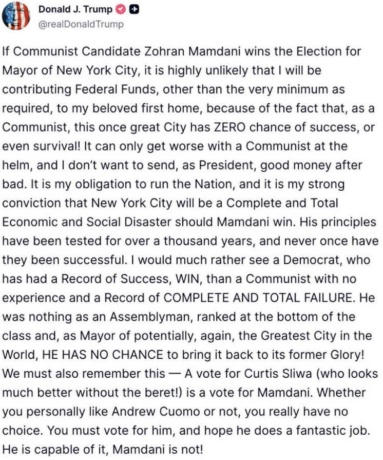 With the election looming on November 4, 2025, Trump framed his support as a pragmatic necessity to block socialist frontrunner Zohran Mamdani, whom he branded a “Communist Candidate” poised to drag the Big Apple into “Complete and Total Economic and Social Disaster.” Trump even threatened to slash federal funding to the bare minimum if Mamdani wins, warning that a communist-led NYC has “ZERO chance of success, or even survival.” Elon Musk echoed the sentiment, piling on with his own endorsement of Cuomo to avert a socialist takeover. Continued below this next clip