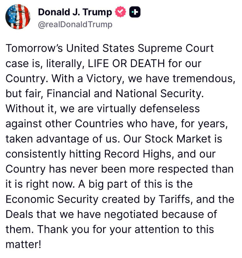 “Tomorrow’s United States Supreme Court case is, literally, LIFE OR DEATH for our Country. With a Victory, we have tremendous, but fair, Financial and National Security. Without it, we are virtually defenseless against other Countries…” – President Donald J. Trump – White House (post at X)