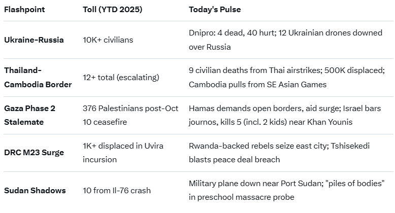 - UN logs 10,000+ civilian casualties YTD—deadliest year yet; today’s Iskander strike on Dnipro claims 4 lives, wounds 40 in residential hit.