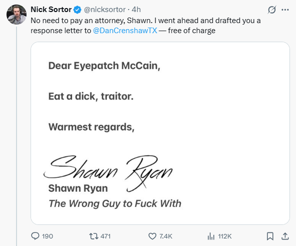 🚨IMMEDIATE RELEASE🚨 Congressman Dan Crenshaw Threatens to Sue Shawn Ryan.@DanCrenshawTX @RepDanCrenshaw pic.twitter.com/9qIV6wLy8k