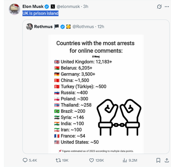 Elon Musk: ‘UK is prison island’ – here are arrest stats for social media posts of various nations – Whatfinger News' Choice Clips