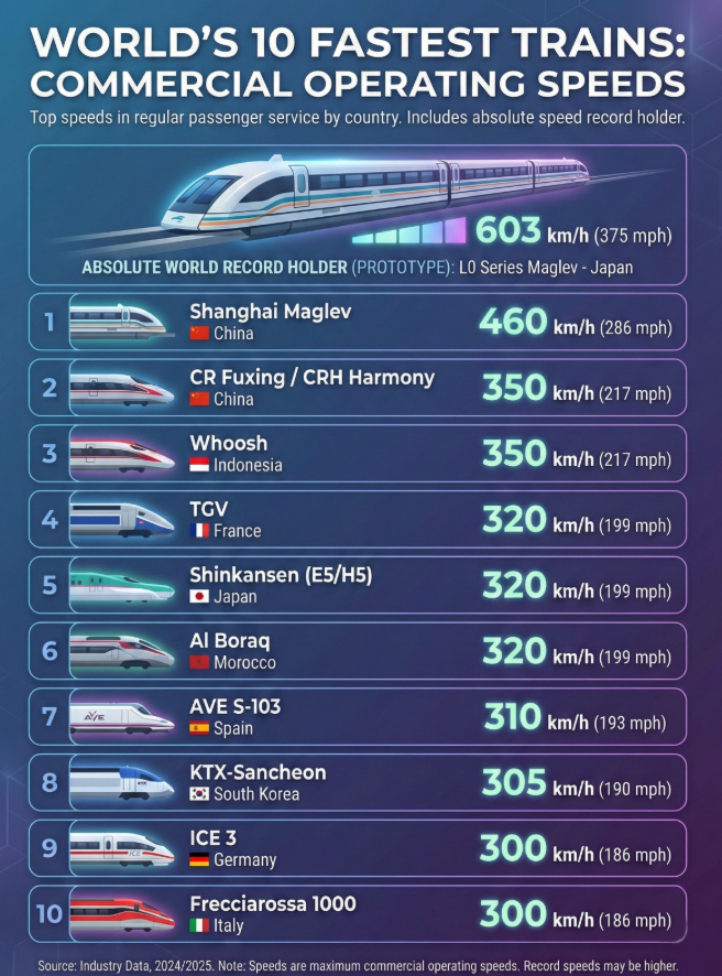 - Japan’s L0 Series Maglev holds the absolute world record for the fastest manned rail vehicle, achieving 603 km/h (375 mph) during tests in 2015.