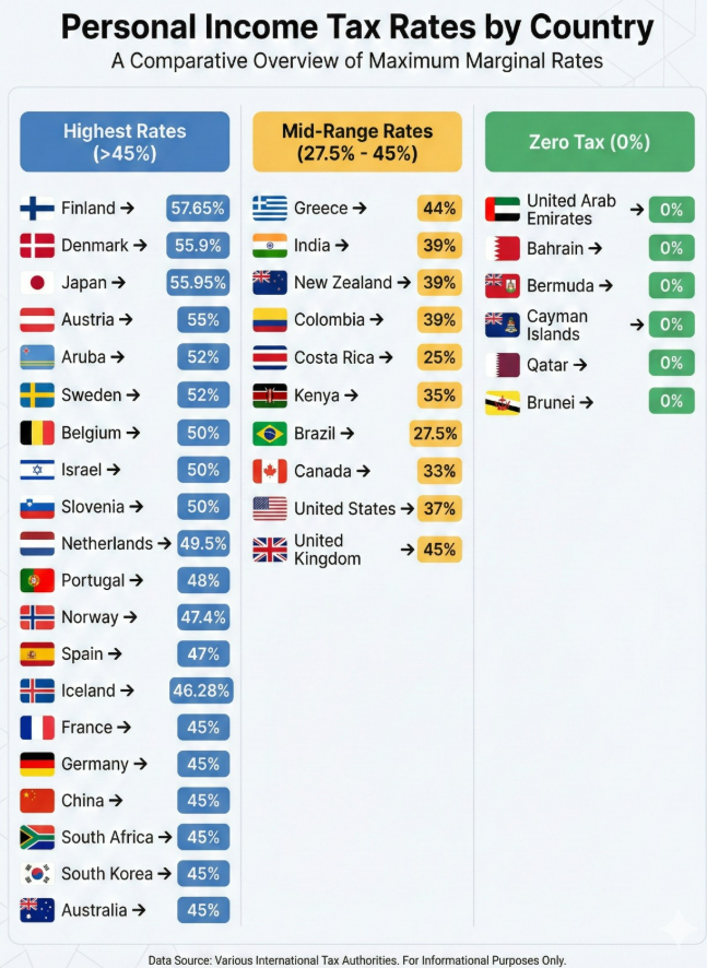 Western nations, broadly defined as those in Europe, North America, and Oceania (Australia and New Zealand) with shared cultural and historical ties (such as the United States, Canada, the United Kingdom, and major European economies), often balance high taxes with extensive social safety nets. For instance, Nordic countries like Finland and Denmark impose some of the world’s highest rates to fund universal healthcare, education, and pensions along with the massive influx of illegals and immigrants that detest them and leech off of them like parasites. In contrast, countries like the United States emphasize lower federal rates to encourage entrepreneurship, though state-level additions can push effective rates higher in certain regions. President Trump has pledged to lower rates further if not eliminate them for all Americans who make 150K or less per year, but that remains to be seen.