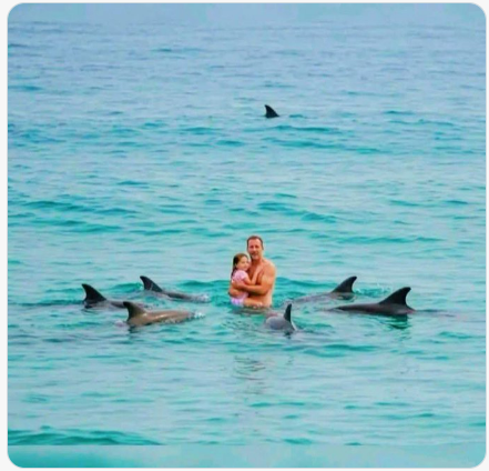 British swimmer Rob Hoey was enjoying a calm swim with his daughter off New Zealand’s North Island when the ocean suddenly revealed something extraordinary. A pod of dolphins appeared out of nowhere, circling tightly around them and gently herding them toward the center. Each time Rob tried to swim away, two dolphins guided him back—protective, insistent, as if guarding against an unseen threat. The danger soon revealed itself: a great white shark, nearly three meters long, was moving into the area. Instantly, the dolphins’ behavior shifted. They slapped the water with their tails, darted in coordinated bursts, and formed a living barrier—clearly working to intimidate and drive the predator away. For almost forty minutes, the dolphins held their protective formation, refusing to let Rob and his daughter leave until the shark finally retreated. Only then did they open the circle, allowing the two swimmers to reach safety. The remarkable scene was witnessed by a lifeguard and several beachgoers, adding to the growing accounts of dolphins displaying extraordinary defensive instincts to shield humans from shark attacks.