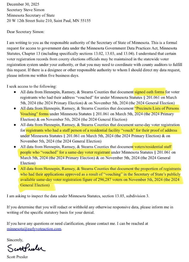 Thank you. After discovering that 1 registered Minnesota voter can vouch for up to 8 others w/o an ID & that a residential facility employee can vouch for unlimited residents, I’ve submitted a Data Practices Request to Secretary Simon for vouching data from Nov. 5th, 2024.