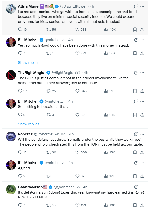 This unbelievable clip drops the red-pill nuke on the Somali fraud scam! She lays it out cold: “You can’t afford another kid because childcare is so expensive – but Somali fraudsters got millions of your taxpayer dollars for child care centers that don’t exist.” “You can’t afford a home – but 100 Somalis spent millions of your taxpayer dollars on luxury properties.” “You’re paying $30K a year for terrible health care – while they got millions of your taxpayer dollars for health care centers they never opened.” That’s the corrupt Dem elites exposed raw – putting unvetted migrants and grifters first while screwing over hardworking Americans. They robbed us blind for years and smeared anyone complaining as racist. Everyday patriots finally shining the light forced the freezes and audits. Trump’s team is cutting off the cash and cleaning house fast. Real Americans are taking our country back! – Bill Mitchell