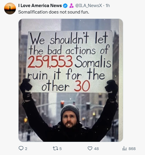 If you missed this critical Stephen Miller segment, watch it now. He exposed Democrats are intentionally driving the “Somalification of America” to cement permanent political power: “What is their objective? The Somalification of America. It’d easier to rule over an empire of ashes than it is for the Democratic party to rule over a functioning, Western, high trust society.” “Look how powerful the Democrat Party became in Minnesota once they flooded it with 100,000 Somalians.” “Once the elections were decided by clan rivalries and ethnic feuds, once that happened, the Democrat Party became permanently powerful in Minnesota. They became permanently powerful in the Twin Cities. That’s their model for America.”
