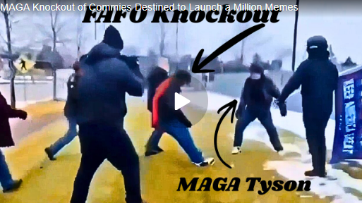 It was the well-deserved knockout punch (and punches) destined to launch a Million Memes. A commie anti-ICE mental case kept blasting loud megaphone noise directly into the ear of a MAGA patriot in a sick effort to cause deafness. As you can see, the anti-ICE cretin had plenty of time and opportunity to stand down and relent. However, he chose to pursue his megaphone madness. Big Mistake. As you can see, when the guy who has come to be known as MAGA Tyson had enough, he delivered a severe beating upon the Megaphone Commie. And when the Commie’s comrades came to his aid by also attacking, MAGA Tyson knocked them all down one by one as you can see. Meanwhile the Megaphone Commie still hadn’t learned his lesson and came back for more and MAGA Tyson delivered to him an EPIC knockout blow.