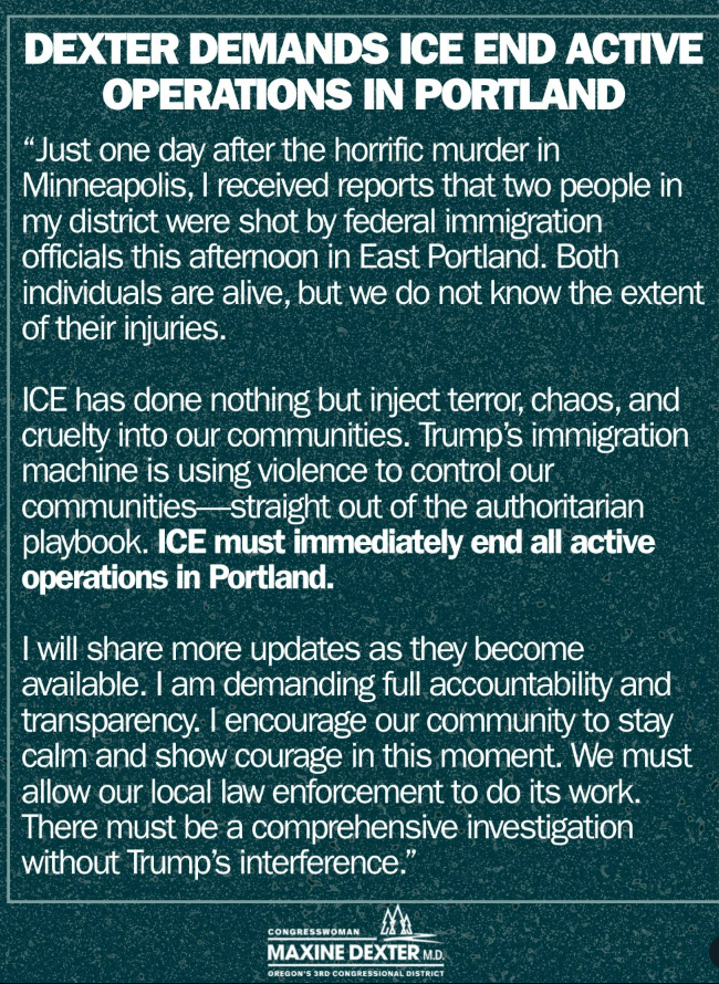 NEW: I caught up w/ progressive Congresswoman Maxine Dexter (D-OR) today & asked her why she didn’t wait for any facts before putting out an inflammatory statement about the Border Patrol shooting in Portland last week, in which she said ICE only brings “terror and cruelty”, is… pic.twitter.com/i1DnWwQ8gc
