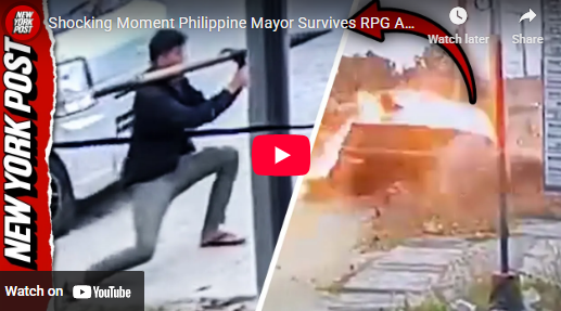 Wild CCTV footage shows the moment a rocket propelled grenade, or RPG, was fired in an attempt to assassinate a mayor in the Philippines on January 25th. Mayor Akmad Ampatuan’s black SUV could be seen being struck in a separate clip, in which the car thankfully was able to make a getaway. According to the regional government, the mayor was unharmed, and two members of his security were injured.