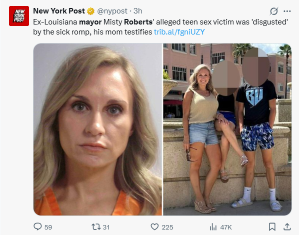 A Louisiana mayor was caught by her own children r*ping one of their 16-year-old friends at pool party, according to a new report. 43-year-old Misty Roberts is currently on trial for third-degree r*pe. After finding out about the alleged assault, the mother of the victim texted the then-mayor to make sure she wasn’t pregnant. Roberts took a screenshot of the messages and shared it in a chat with friends before ordering Plan B on DoorDash. The son of Roberts explained to investigators that he saw his mother having s*x with his friend before changing his story. Roberts’ ex-husband recently testified that she told him directly that she had s*x with the teen. “A photo seen by the jury showed Roberts at the party in her bikini, with the teen victim looking up at her and smiling,” the New York Post reported. “The victim’s friend said Roberts’ daughter told a group of teens that night she saw her mom and the minor making out by the pool. He said he later he saw Roberts and the boy having s*x.” – Collin Rugg Post